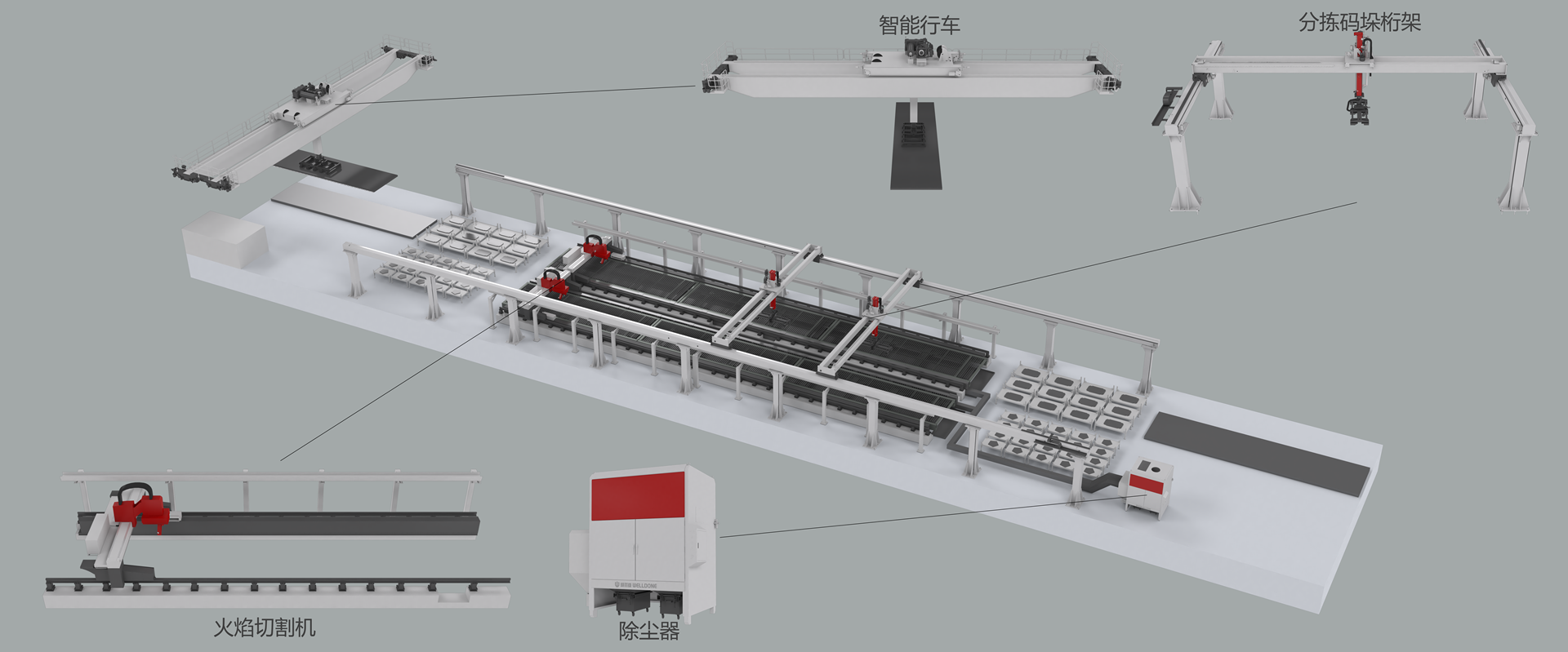 智能行車采用雙梁桁架式設計,伺服驅動,具備定位精準、運行穩(wěn)定、快速靈活功能,可轉運超大超重板材。其他輔助功能如板材分離裝置并帶吹氣和雙張檢測裝置,即使在意外斷電和斷氣時也不會墜物,提升機器運行安全性。