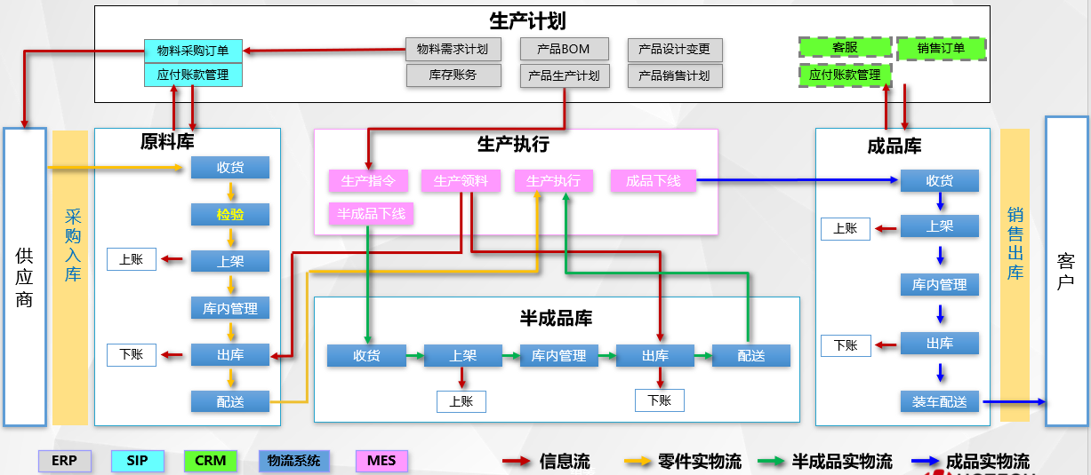 自動(dòng)化物流倉(cāng)庫(kù)系統(tǒng)大致可分為三個(gè)層次,最上層是ERP/MES/APS,負(fù)責(zé)整場(chǎng)加工流轉(zhuǎn)業(yè)務(wù)邏輯的處理;中間是核心層,集成各種自動(dòng)物料搬送設(shè)備控制系統(tǒng),其功能是接收MES/APS系統(tǒng)的訂單任務(wù),優(yōu)化分解、應(yīng)用智能算法將物流系統(tǒng)生成的任務(wù)在適當(dāng)?shù)臅r(shí)機(jī)轉(zhuǎn)化為設(shè)備動(dòng)作指示,并根據(jù)設(shè)備動(dòng)作的狀態(tài)向WMS、ASS發(fā)送信息;最下層是設(shè)備管理系統(tǒng)EIS,負(fù)責(zé)具體的物流設(shè)備控制系統(tǒng)如AGV-RCS系統(tǒng)、自動(dòng)化立庫(kù)WCS系統(tǒng)等。本項(xiàng)目中信息系統(tǒng)包括物流中心原材料、半成品、成品的線邊及緩存庫(kù)管理系統(tǒng)。